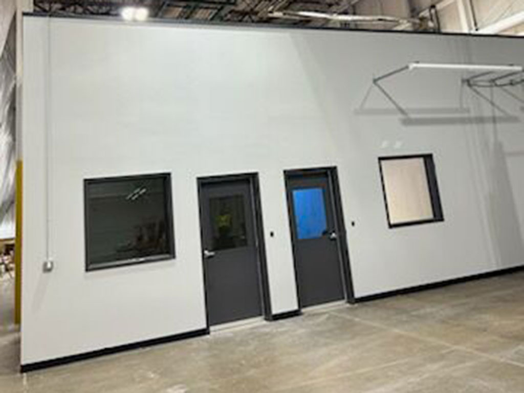 The crew installed temporary curtain walls to contain the effects of work; demolished warehouse racking and obstructions; metal framed new structures; hung and finished drywall; installed laminate wall protection, wood wainscot wall protection, chair rail, wood trim, setting millwork, countertops and cabinets; installed door frames, doors and hardware, acoustical and drywall ceilings. A fresh coat of paint brightened the new configuration.